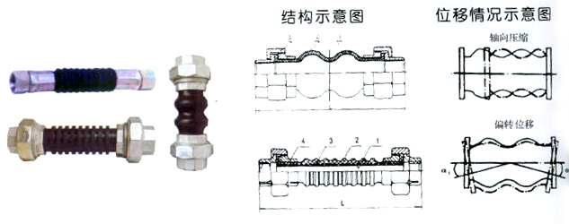 该产品为尼龙帘布增强的橡胶制品。具有耐高压、弹性好、位移多变、减震降噪好,用于住宅、宾馆等水暖管道及化工防腐管道等场合的施用。 各部分材质 序号 部位 材料 1 内胶层 耐热橡胶 2 外胶层 耐老化橡胶 3 增强层 尼龙帘布 4 螺纹活接头 可锻铸铁 技术条件 工作压力 1.6MPa 爆破压力 4.8MPa 适用温度 -20-115℃ 适用介质 水、热水、空气 主要连接尺寸 公称通径DN 长度L 轴向压缩 轴向伸长 横向位移 偏转角度 A型 B型 15 180 195 10 5 20 45° 20 200 220 10 5 20 45° 25 220 240 10 5 20 45° 主要连接尺寸 DN大 ×DN小(mm) 长度 轴向 压缩轴向伸长 径向位移 角向位移 20×15 200 10 5 25 45° 25×20 220 10 5 25 45° 32×25 220 10 5 25 45° 40×32 240 10 5 25 45°